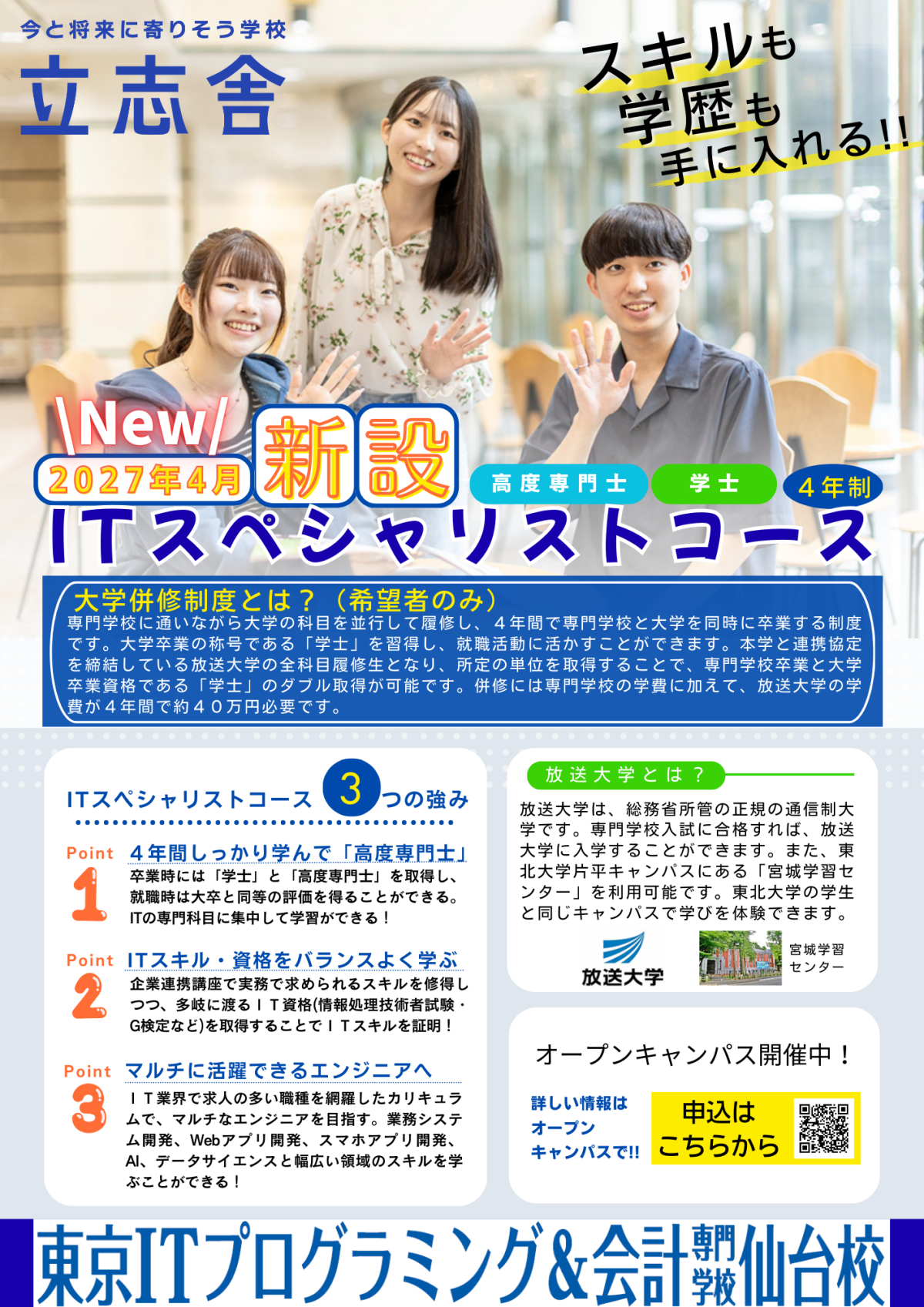 【新設のお知らせ】2027年4月ITスペシャリストコース(4年制)